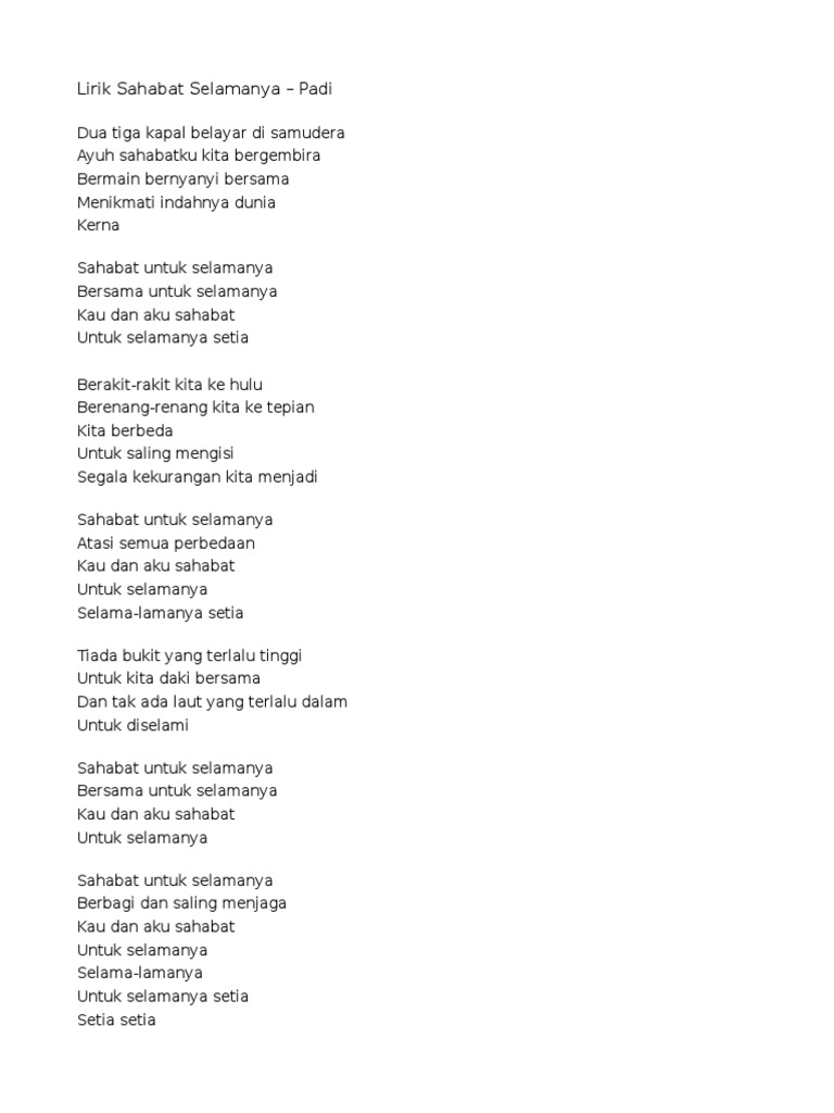 Dua tiga kapal berlayar di samudra Ayo sahabatku kita bergembira Bermain bernyanyi bersama Menikmati indahnya dunia. Berikut lirik lagu OST Layangan Putus Sahabat Dulu - Prinsa. Lirik Lagu Sahabat Selamanya Padi.